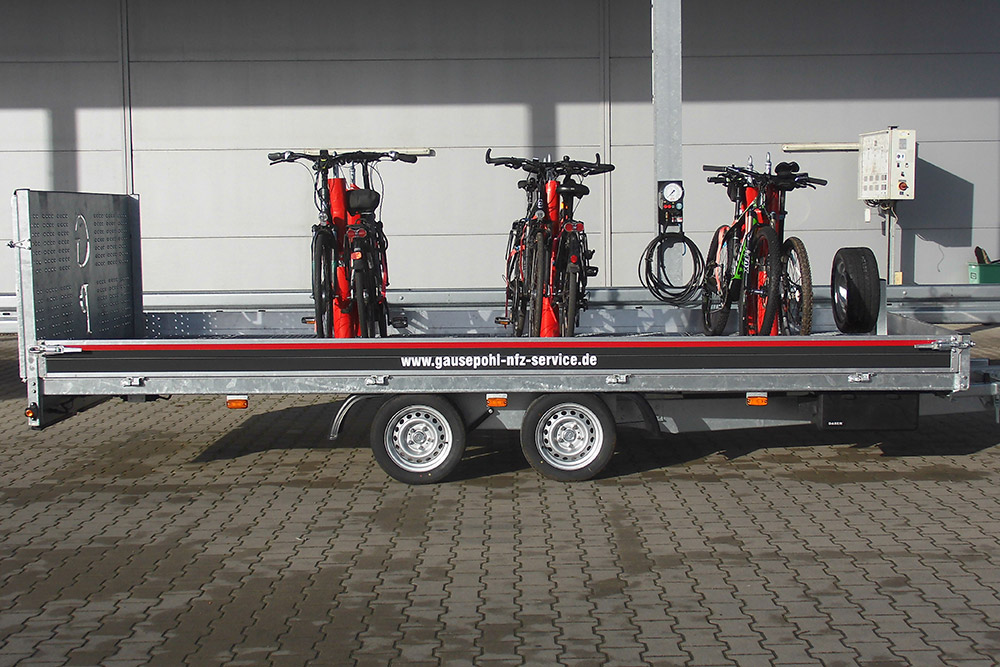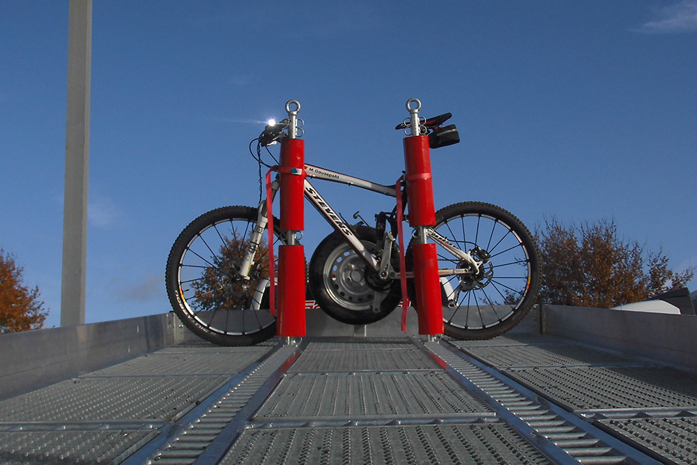 Das durchdachte System ermöglicht eine Absenkung des Anhängers und dient somit gleich als Auffahrrampe. So können z. B. Fahrräder, E-Bikes und andere Zuladungen bequem auf den Hänger verladen und positioniert werden. Mithilfe eines flexiblen und variablen Stecksystems können die Ladungen optimal befestigt und fixiert werden.