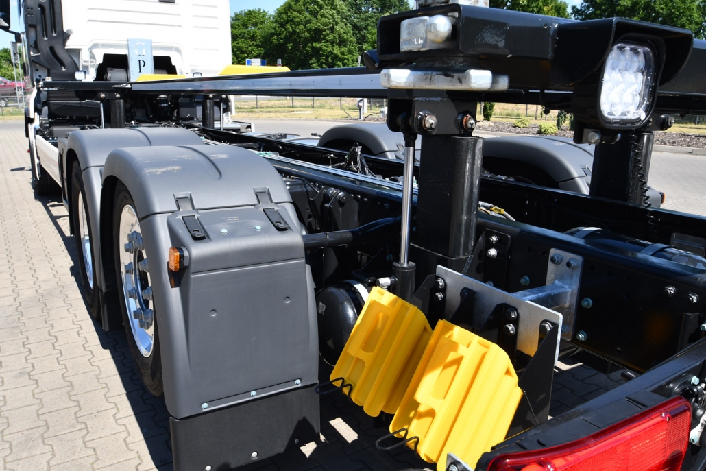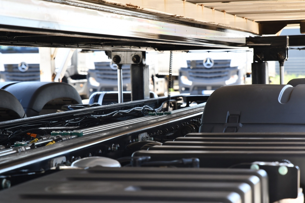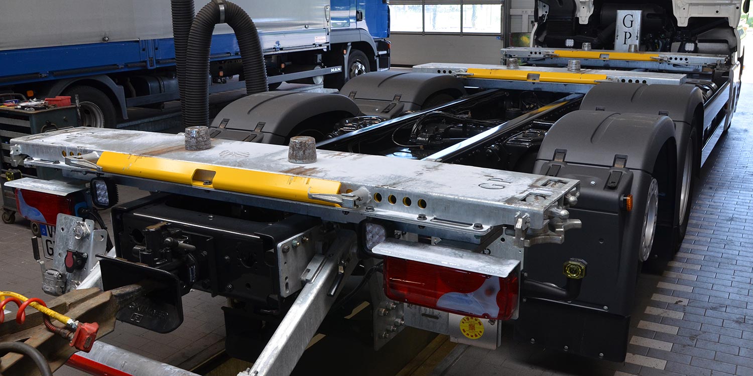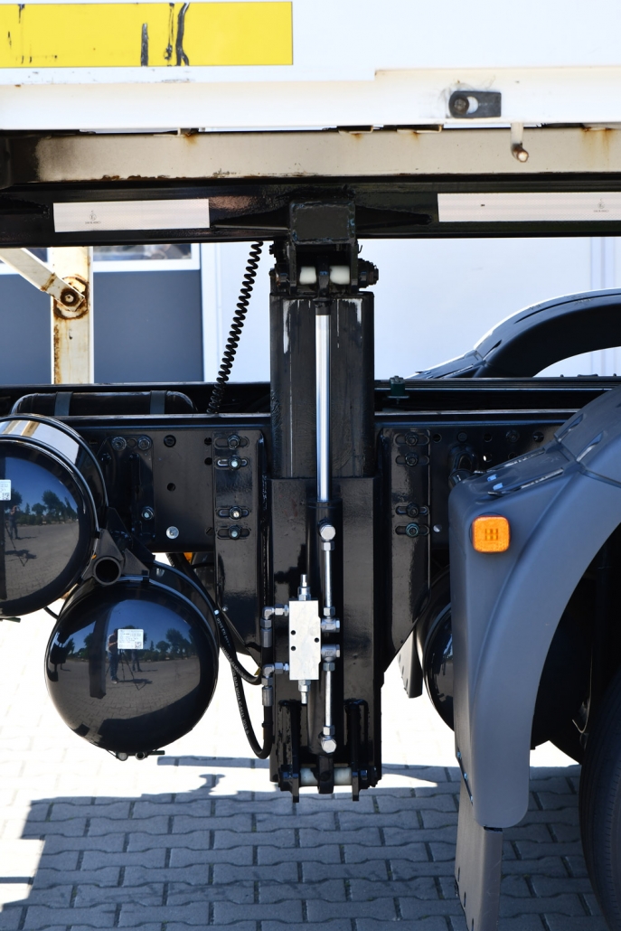 Mit einer innenliegenden Hydraulikpumpe wird die Hydraulikflüssig- keit aus dem Vorratsbehälter mit ca. 210 bar Betriebsdruck – über den 4-fach-Zahnradmengenteiler – zum Hydraulikzylinder gefördert. Durch die Lasthalteventile kann der Hilfsrahmen in jeder Stellung bis zu 24 Tonnen Gesamtgewicht (4 Zylinder je 6 Tonnen) gesteuert werden. Durch die Silentbuchsenlagerung bei den Führungsböcken wird ein spannungsfreies Verstellen des Hilfsrahmen erreicht.