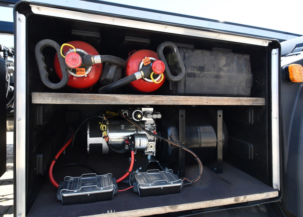 Durch das Bestätigen des Bedienschalters beim Fahrersitz, wird der Hilfsrahmen hydraulisch in die Auf- und Abwärtsbewegung über den Steuerstrom geschaltet. Der Laststrom wird über die Fahrzeugbatterie zu dem Elektromotor geleitet. In einer Verteilerdose im verbauten Werkzeugkasten werden die beiden Stromkreise abgesichert.